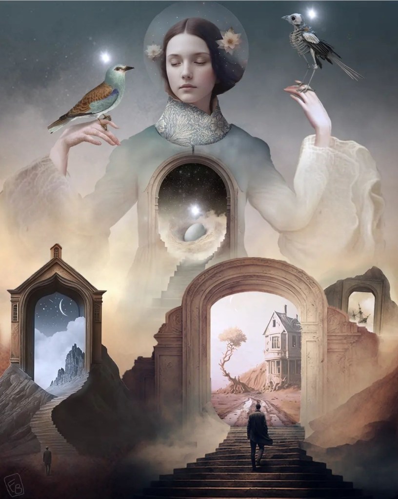 "Genevieve, spiritual astrologer, writer, and founder of Becoming Lotus, in a serene garden setting. Wearing a black embroidered blouse and layered crystal necklaces, she radiates wisdom and esoteric insight. The background features sacred geometry-inspired metal structures, lush plants, and a rustic barn with a star, evoking themes of astrology, mysticism, and cosmic connection. A guiding voice in Galactic Astrology, esoteric wisdom, and soul evolution."