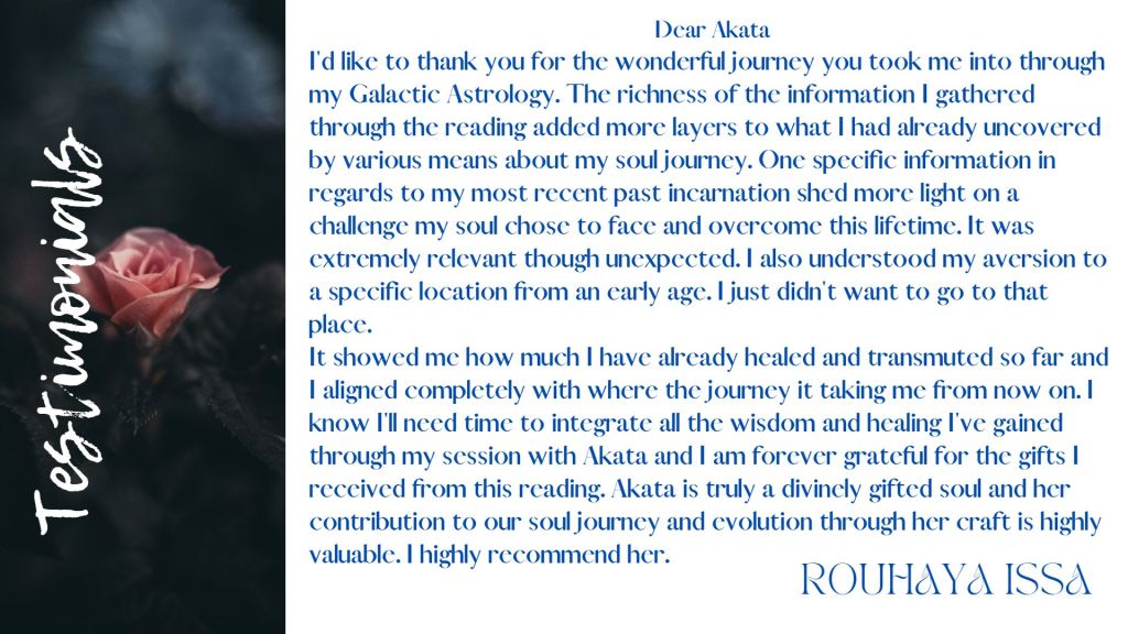It showed me how much I have already healed and transmuted so far and I aligned completely with where the journey it taking me from now on. I know I’ll need time to integrate all the wisdom and healing I’ve gained through my session with Akata and I am forever grateful for the gifts I received from this reading. Akata is truly a divinely gifted soul and her contribution to our soul journey and evolution through her craft is highly valuable. I highly recommend her.”