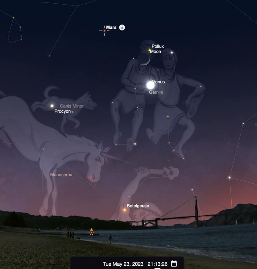 Tonight look towards the W after sunset for the the crescent Moon near superbright Venus. Above the cosmic pair is Mars. Also when it does get dark look for the twin Gemini stars Pollux/Castor next to the Moon.