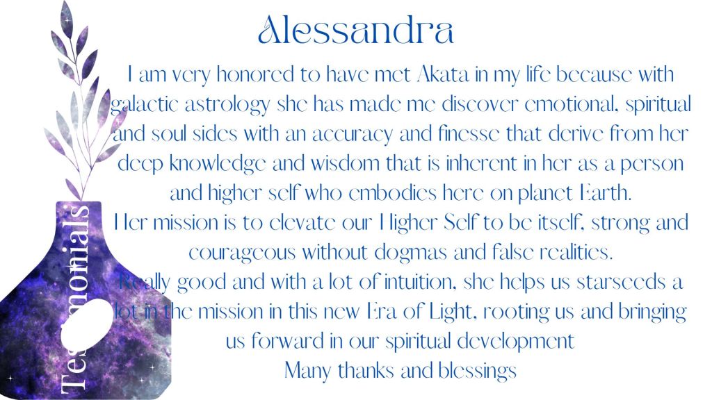 “Sono molto onorata di aver incontrato Akata nella mia vita perchè con l’astrologia galattica mi ha fatto scoprire lati emotivi, spirituali e della mia anima con un accuratezza e finezza che derivano dalla sua profonda conoscenza e saggezza che è insita in lei come persona e anima superiore che incarna qui sul pianeta Terra.